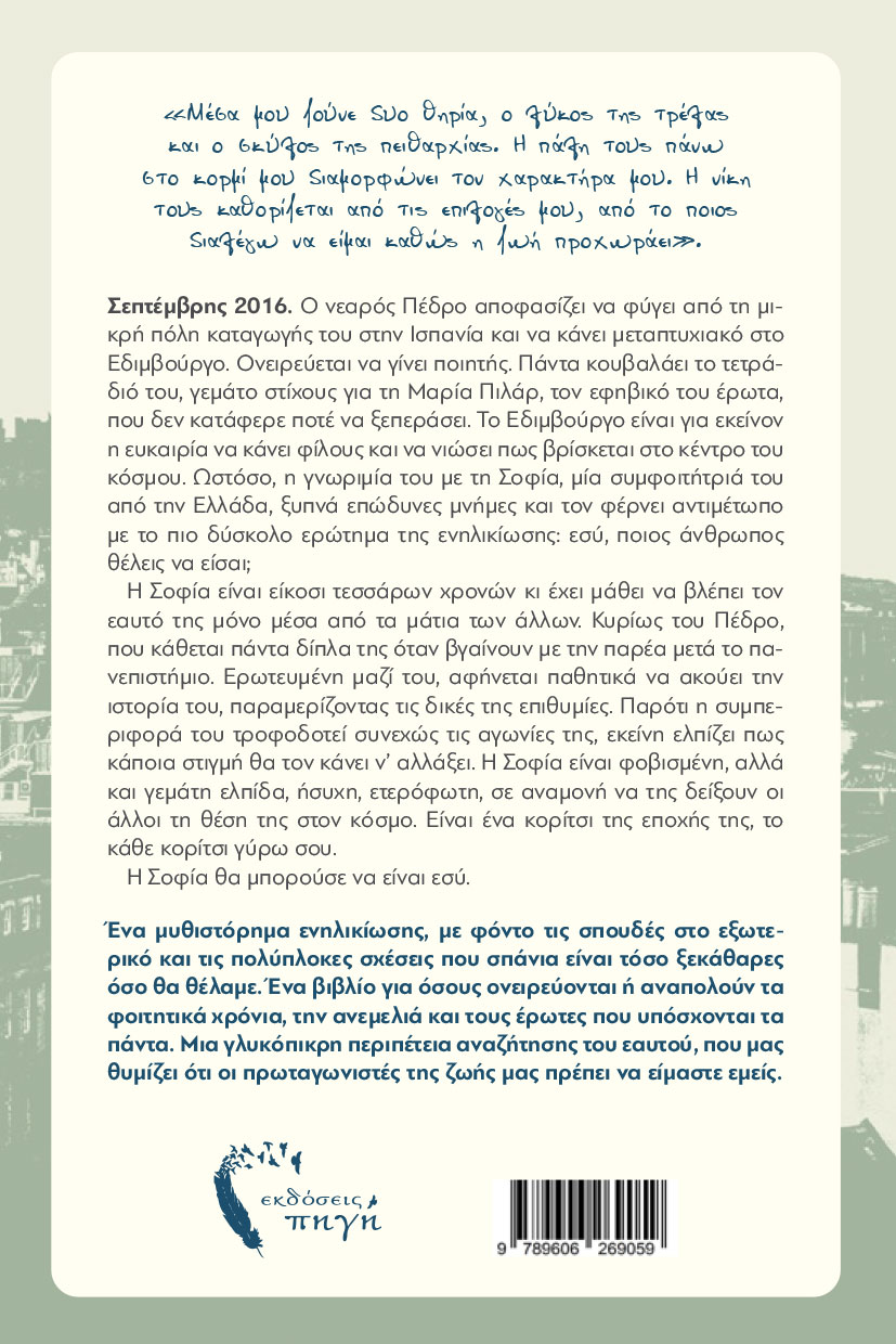 Ένα μυθιστόρημα ενηλικίωσης, με φόντο τις σπουδές στο εξωτερικό και τις πολύπλοκες σχέσεις που σπάνια είναι τόσο ξεκάθαρες όσο θα θέλαμε. Ένα βιβλίο για όσους ονειρεύονται ή αναπολούν τα φοιτητικά χρόνια, την ανεμελιά και τους έρωτες που υπόσχονται τα πάντα. Μια γλυκόπικρη περιπέτεια αναζήτησης του εαυτού, που μας θυμίζει ότι οι πρωταγωνιστές της ζωής μας πρέπει να είμαστε εμείς.