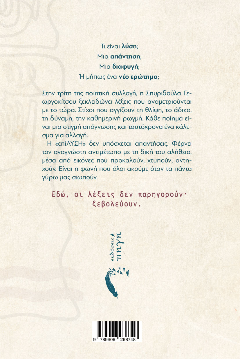Η «επίΛΥΣΗ» δεν υπόσχεται απαντήσεις. Φέρνει τον αναγνώστη αντιμέτωπο με τη δική του αλήθεια, μέσα από εικόνες που προκαλούν, χτυπούν, αντηχούν. Είναι η φωνή που όλοι ακούμε όταν τα πάντα γύρω μας σιωπούν.