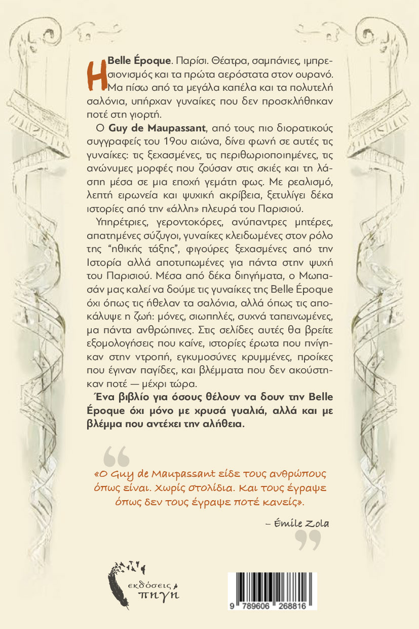 Υπηρέτριες, γεροντοκόρες, ανύπαντρες μητέρες, απατημένες σύζυγοι, γυναίκες κλειδωμένες στον ρόλο της “ηθικής τάξης”, φιγούρες ξεχασμένες από την Ιστορία αλλά αποτυπωμένες για πάντα στην ψυχή του Παρισιού. Μέσα από δέκα διηγήματα, ο Μωπασάν μας καλεί να δούμε τις γυναίκες της Belle Époque όχι όπως τις ήθελαν τα σαλόνια, αλλά όπως τις αποκάλυψε η ζωή: μόνες, σιωπηλές, συχνά ταπεινωμένες, μα πάντα ανθρώπινες. Στις σελίδες αυτές θα βρείτε εξομολογήσεις που καίνε, ιστορίες έρωτα που πνίγηκαν στην ντροπή, εγκυμοσύνες κρυμμένες, προίκες που έγιναν παγίδες, και βλέμματα που δεν ακούστηκαν ποτέ — μέχρι τώρα.